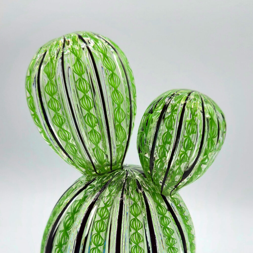 Je vous présente le Cactus, une pièce soufflée et façonnée à la main. Cette création est exposée sous une cloche en verre de 22 cm de hauteur et 11,5 cm de largeur, scellée sur un socle de 3 cm d’épaisseur en cristal recyclé.